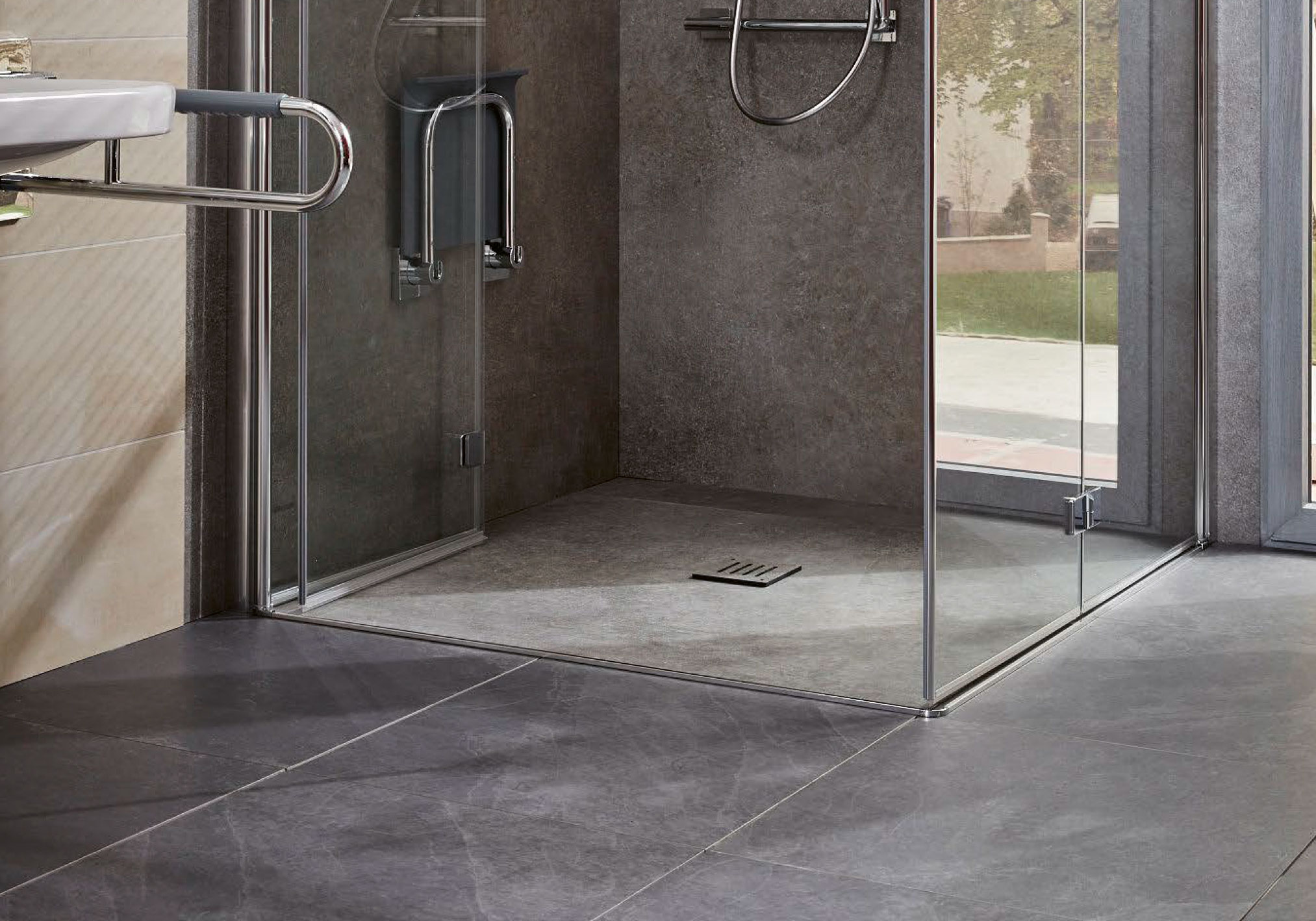 Eine befahrbare Dusche mit platzsparendem Duschsitz zum Ausklappen und Haltegriffen zum Festhalten.